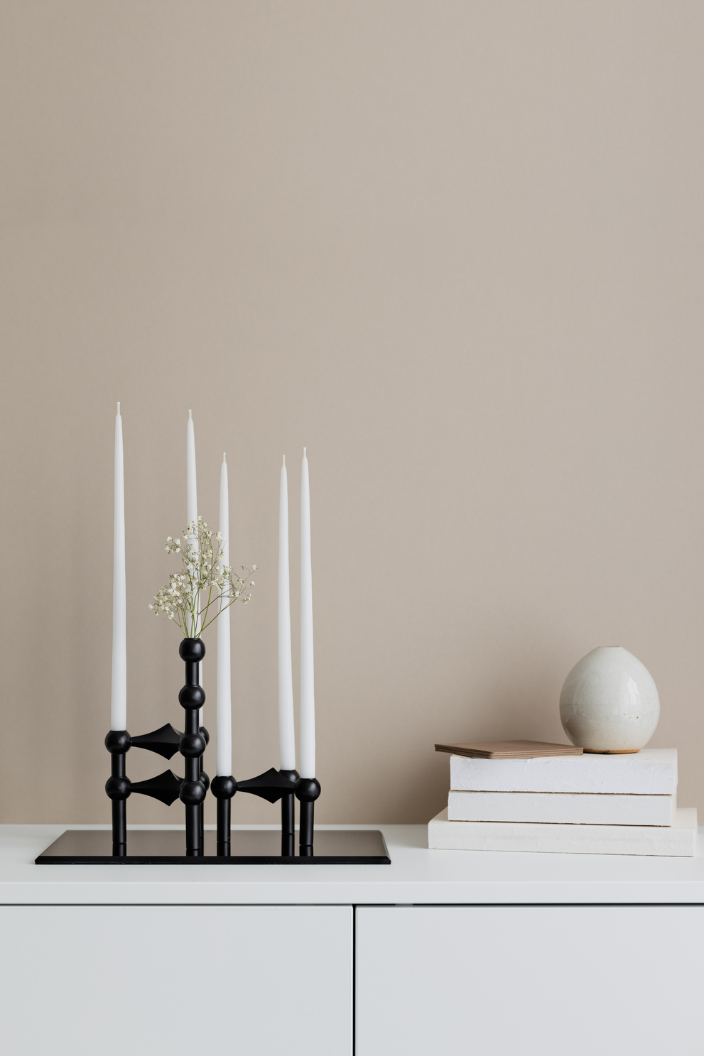 Kerzenhalter Stoff matt schwarz: Ursprünglich für die Firma Nagel in Köln entwarf der deutsche Architekt Werner Stoff in den sechziger Jahren den Kerzenständer als ein Stecksystem. Denn das einzelne Element kann beliebig ergänzt und zusammengesteckt werden – so lassen sich ganze Skulpturen formen. Die Idee zu diesem Design kam Werner Stoff unseres Wissens beim Beobachten der Spuren im Schnee.